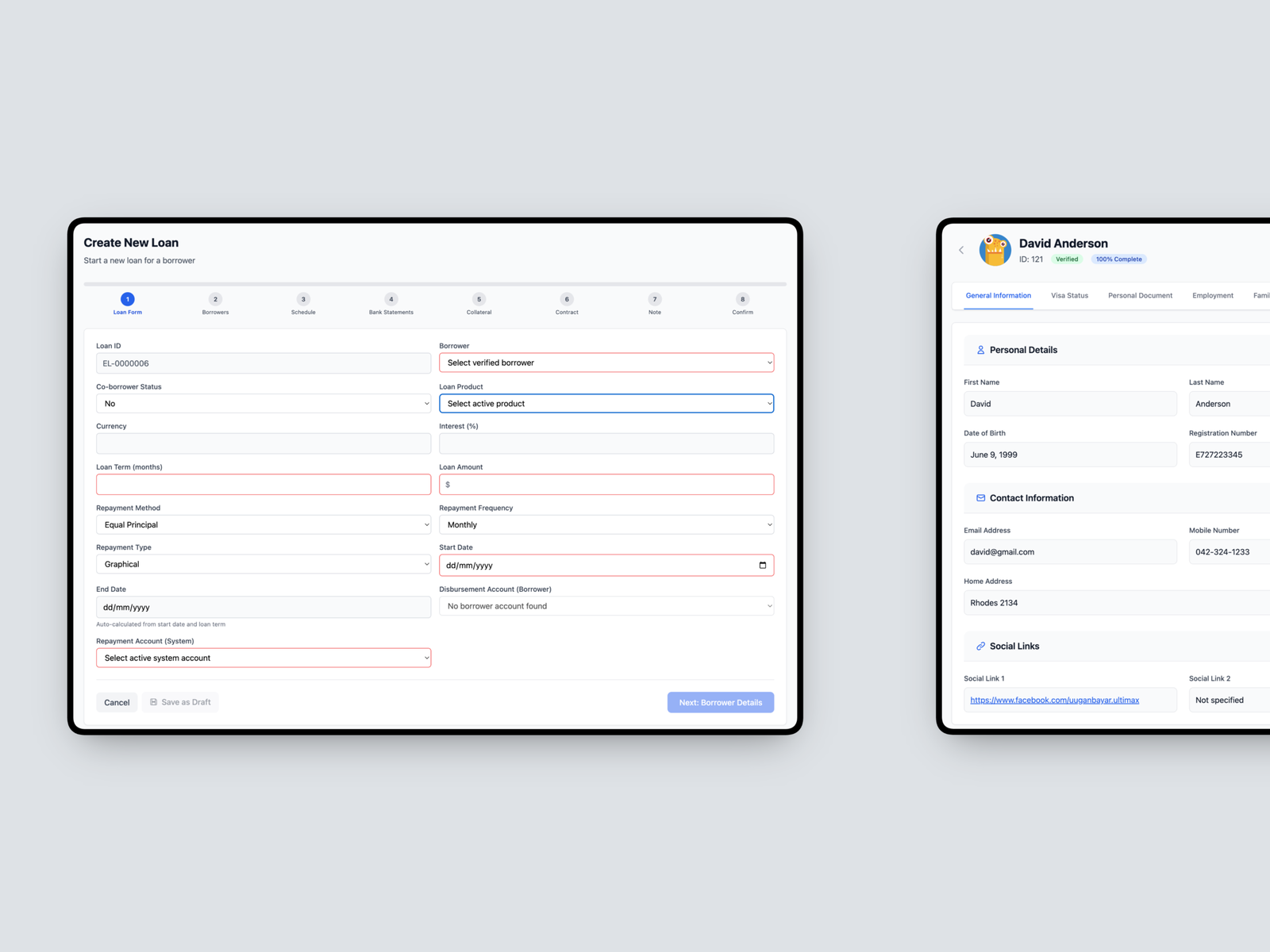 Maintain verified borrower profiles with personal details, documents, employment, bank accounts, and active loans.