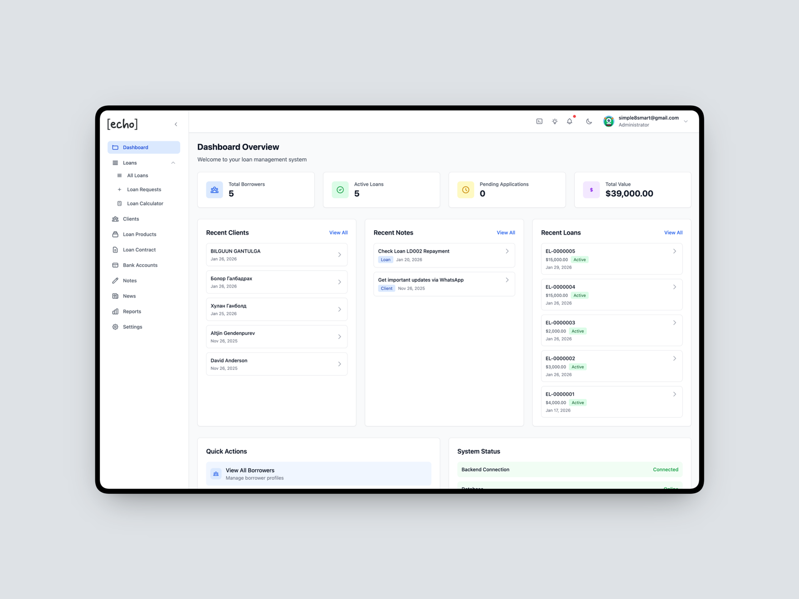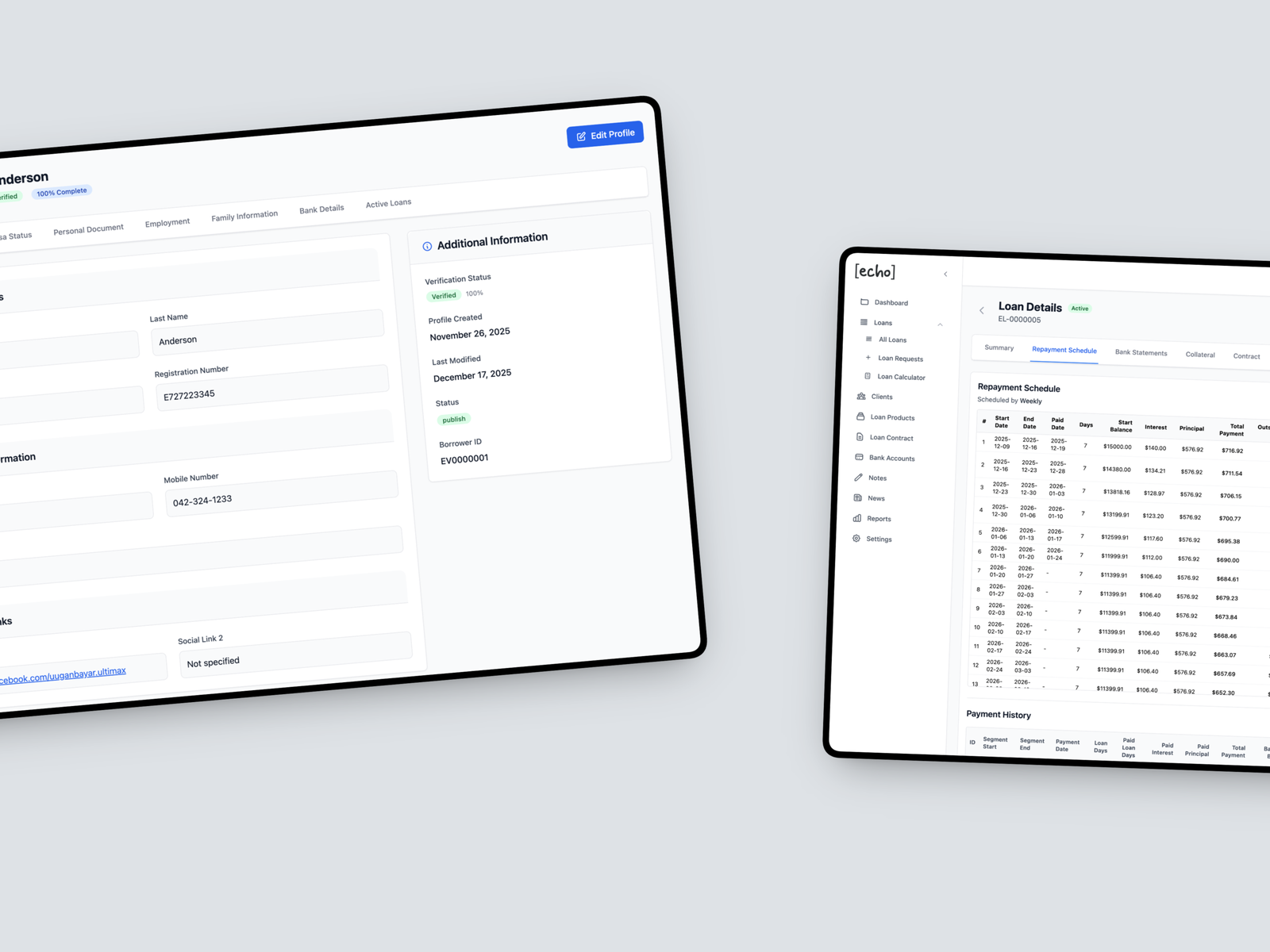 A practical loan management system designed to support growing financial organisations. EchoVault is a modern loan management system designed for small to medium-scale lending organisations. It brings clarity, control, and flexibility to every stage of the loan lifecycle — from borrower onboarding to repayment tracking and reporting.
