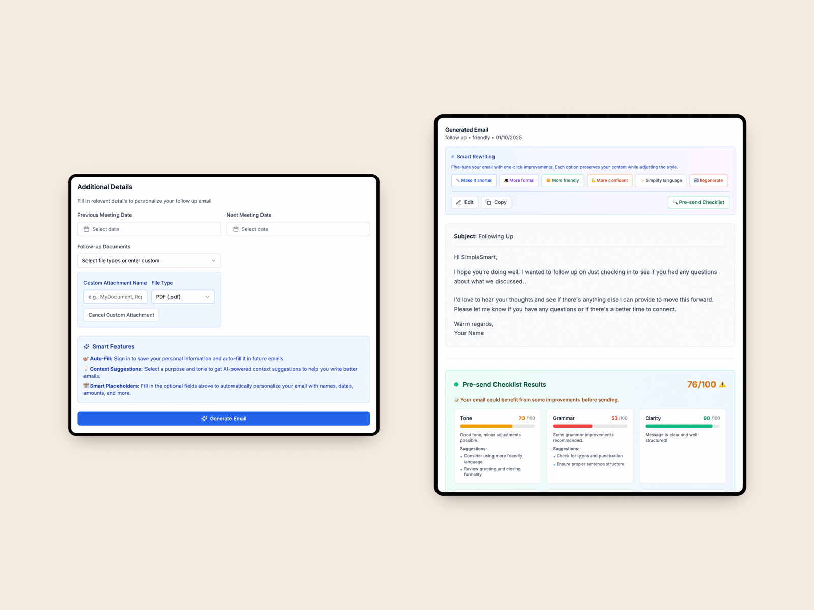 Registered users gain access to advanced features such as email analytics and template management. With built-in analytics, the system can review writing style, tone, and effectiveness, giving users valuable insights to improve their communication. At the same time, the template library allows frequently used emails — from customer responses to business proposals — to be saved and reused, making everyday communication faster and more consistent.